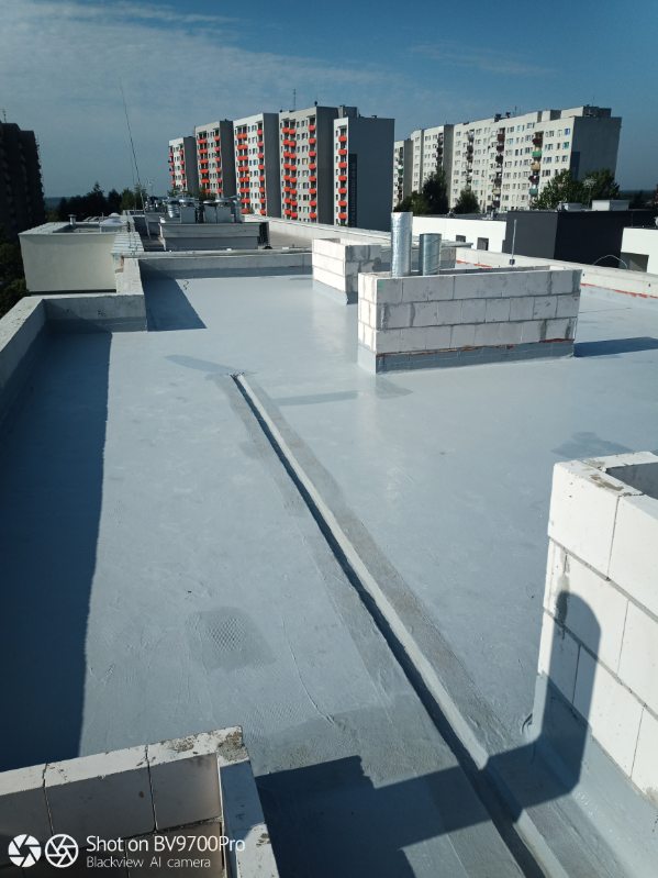 Wykonanie pełnej hydroizolacji dachu płaskiego w systemie płynnych membran: warstwa podkładowa oraz nawierzchniowa odporna na promieniowanie UV.